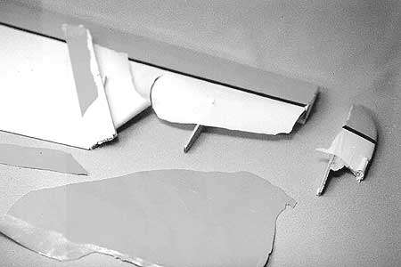 Gunakan Lakban untuk melakukan perbaikan apabila terdapat bagian kerusakan yang membutuhkanpenambalan. Khususnya pada bagian Leading Edge, selain memotong bagian yang rusak dan menjiplaknya pada balsa baru, mengamplas dan membentuk konturnya sesuai yang dibutuhkan. Cara menambalnya cukup mudah, amplas bagian yang rusak sesuai dengan bentuk konturnya. gunakan lakban untuk menutupi, sisakan sedikit ruang yang terbuka untuk lem epoxy, masukan epoxy ke bagian yang terbuka itu, biarkan epoxy mengisi seluruh ruang yang ada, setelah kering buka lakbannya dan kamu akan mendapatkan kontur yang di inginkan.setelah itu lepaskan lakbannya. |